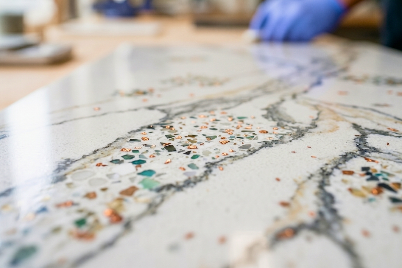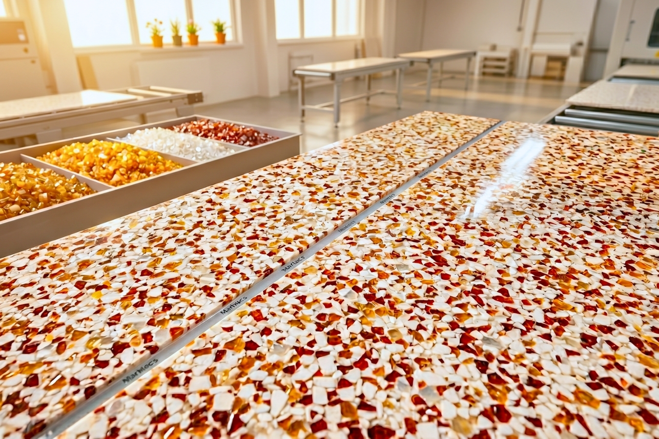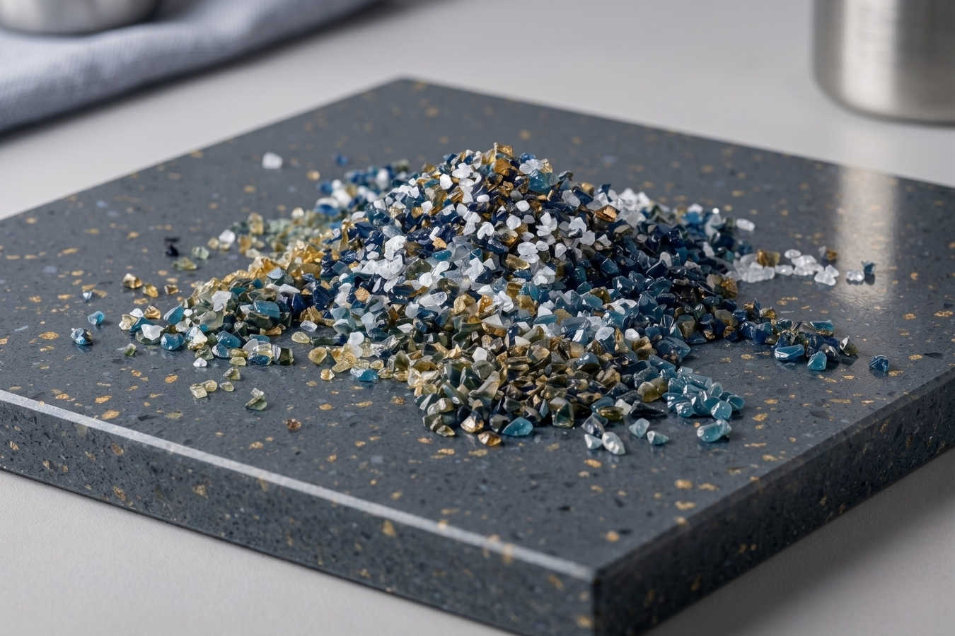Marktec chips provide the vibrant patterns and structural integrity found in the world’s finest solid surfaces. Our materials are UV-stabilized to prevent fading from sunlight and non-porous to resist everyday stains, ensuring your kitchen islands and bathroom vanities stay as beautiful as the day they were installed.